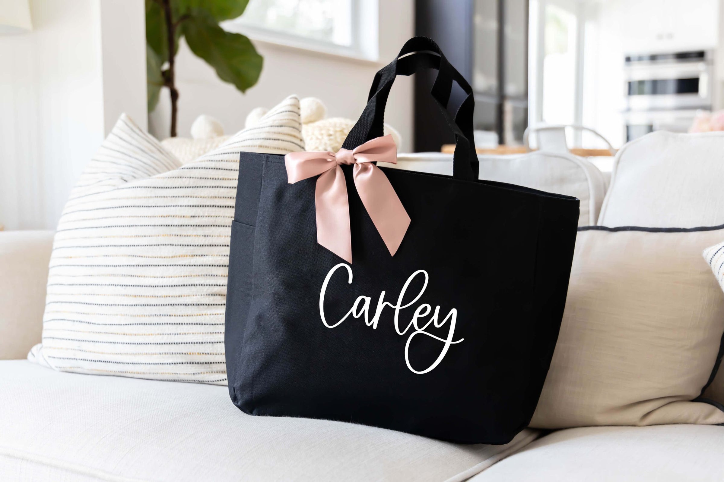 Surprise your bridal party with these personalized bridesmaid tote bags—perfect for packing wedding day must-haves or gifting with flair! Each tote features a custom name design and bow detail, making it one of those custom bridesmaid gifts they'll actually use again. Stylish, roomy, and super functional for the big day and beyond.
