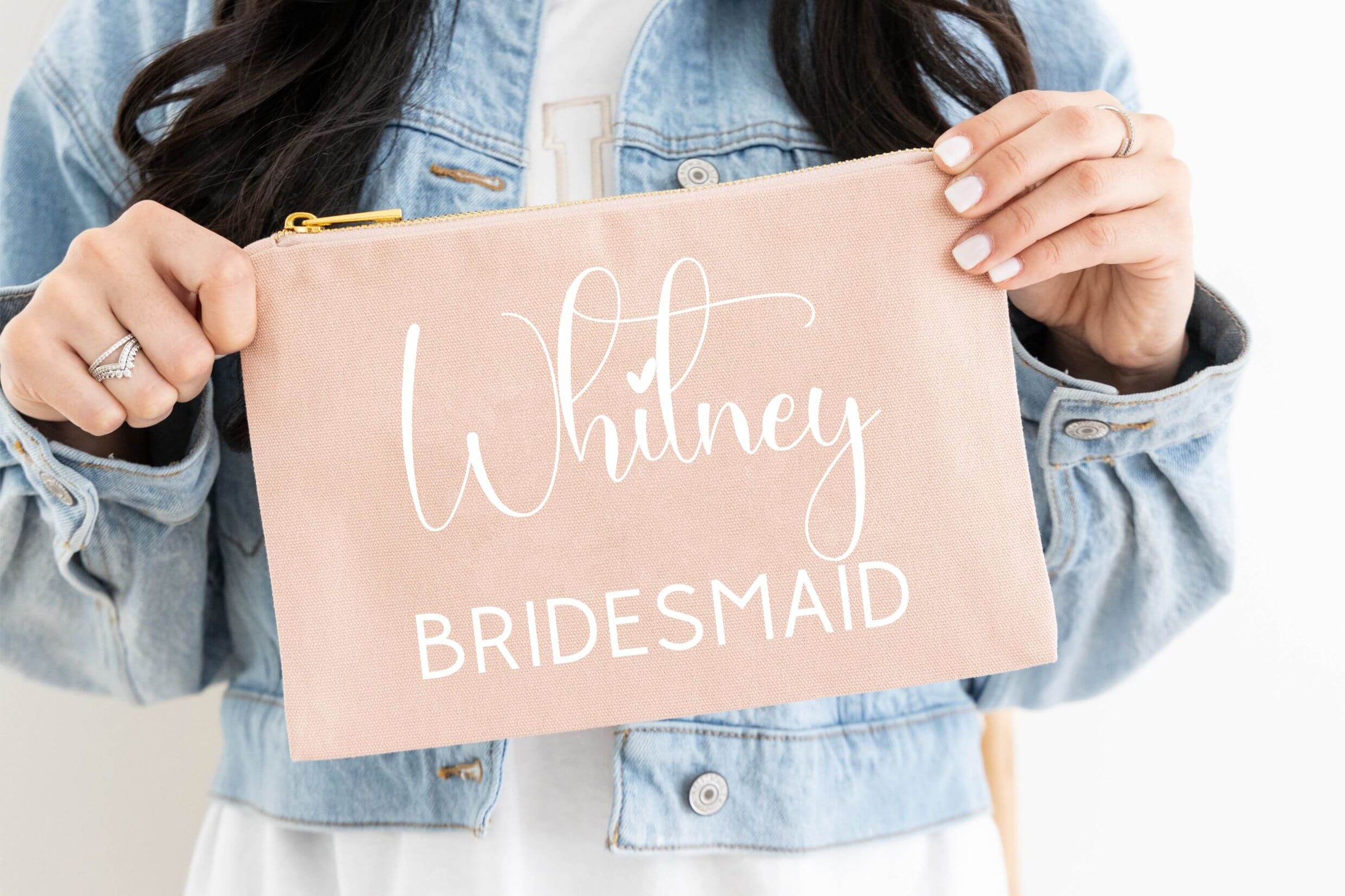This bridesmaid makeup bag is a must-have for your bridal party! Featuring each name in a chic script font and a secure zipper top, these custom makeup bags keep essentials organized on the big day and beyond. They’re lightweight, cute, and easy to toss into a larger tote. Whether you’re gifting your girls or prepping for a bachelorette weekend, these personalized bridesmaid gifts are always a hit!