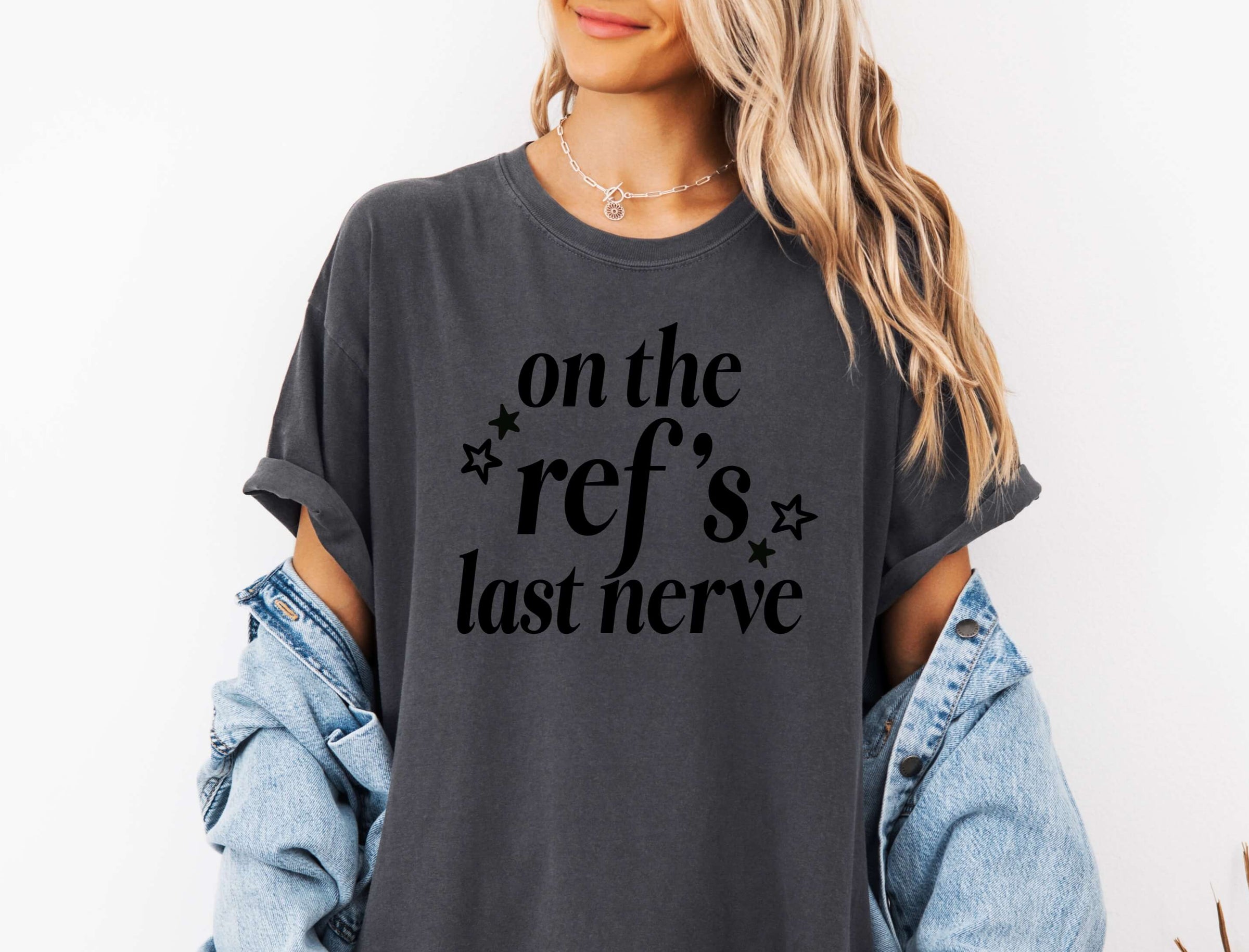 Bring the sideline sass with this funny comfort colors gameday shirt! Featuring a bold “on the ref’s last nerve” graphic, this game day tee shirt is a must for every sports mom who takes the game seriously (but with a sense of humor). Made on your fave Comfort Colors tee, it’s perfect for football Fridays, tournament weekends, or anytime you’re calling plays from the stands. Customize the color and size to fit your style—because looking cute while yelling at the ref is a skill!